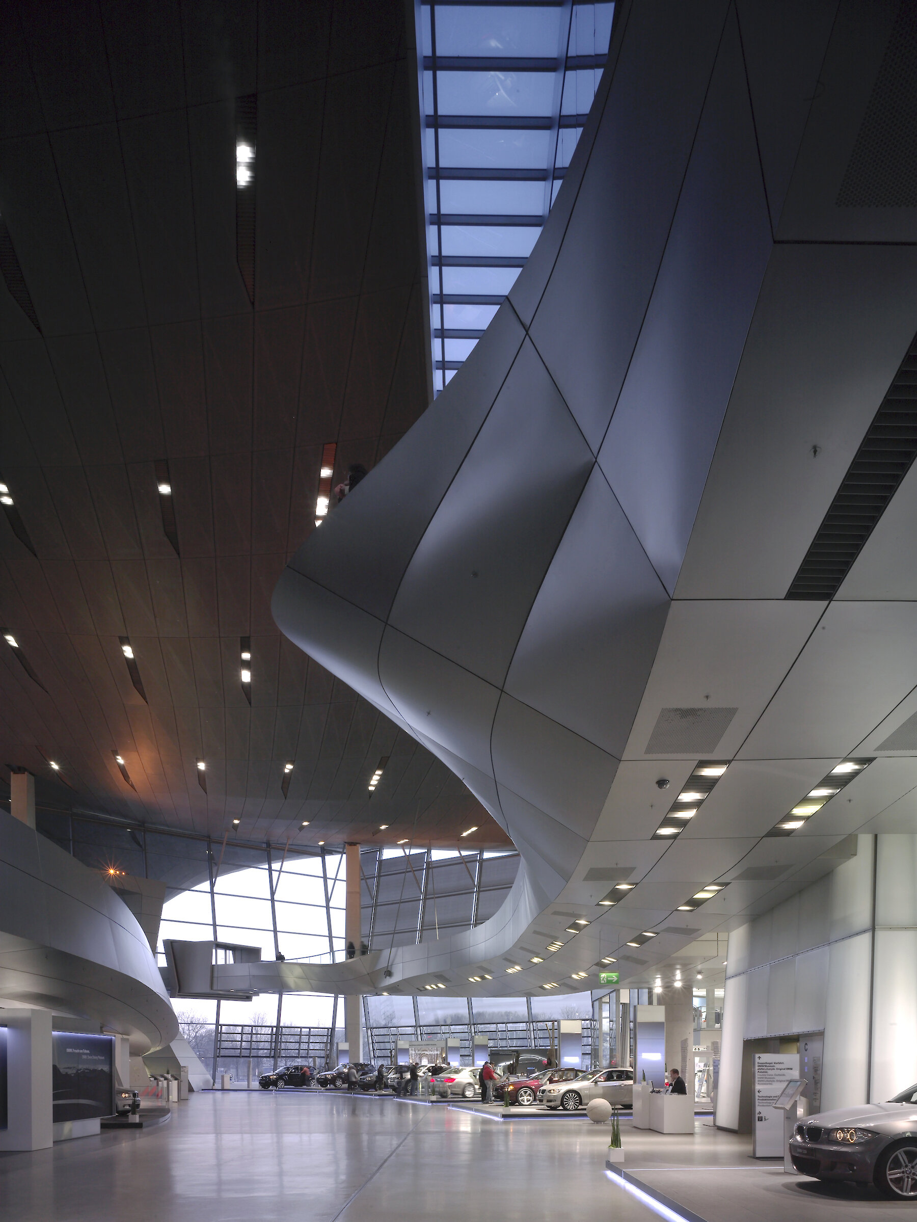 宝马世界的核心设计理念之一是扩展现有的宝马塔楼和宝马博物馆,藉由增加一个建筑元素,创造一个充满空间性与识别性的建筑群体。与现有公司总部大楼的建筑类型不同,蓝天组的设计方案是由一个带有雕塑屋顶和双锥体的大型透明大厅组成, 而宝马世界由五大主题区域组成: 展示大厅、新车交付中心、论坛交流区、餐厅和双锥体。
