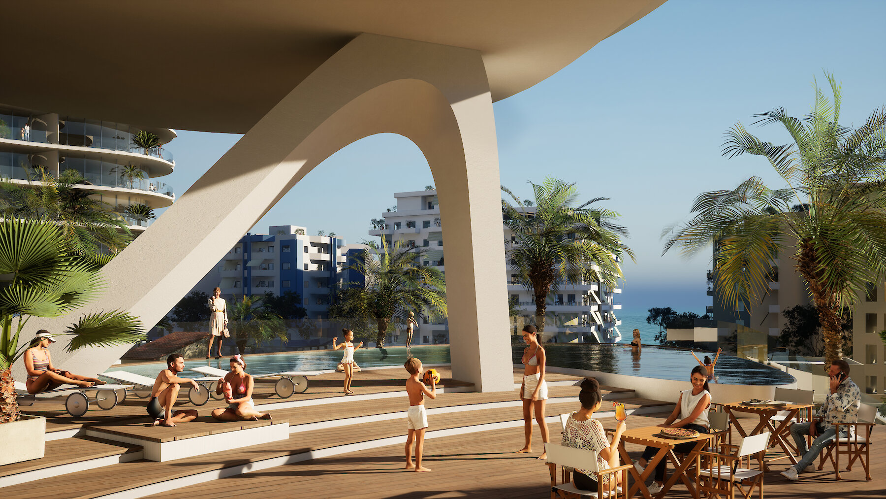 The two towers feature distinct floor layouts: the hotel adopts a compact, amoeba-shaped plan that maximize sea views, while the residential tower, benefiting from a larger site area, is organized around a soft-edged Y-shaped floor plan. Both layouts are designed to ensure high spatial efficiency and controlled floorplate depth, maximizing natural daylight penetration throughout all interior spaces.